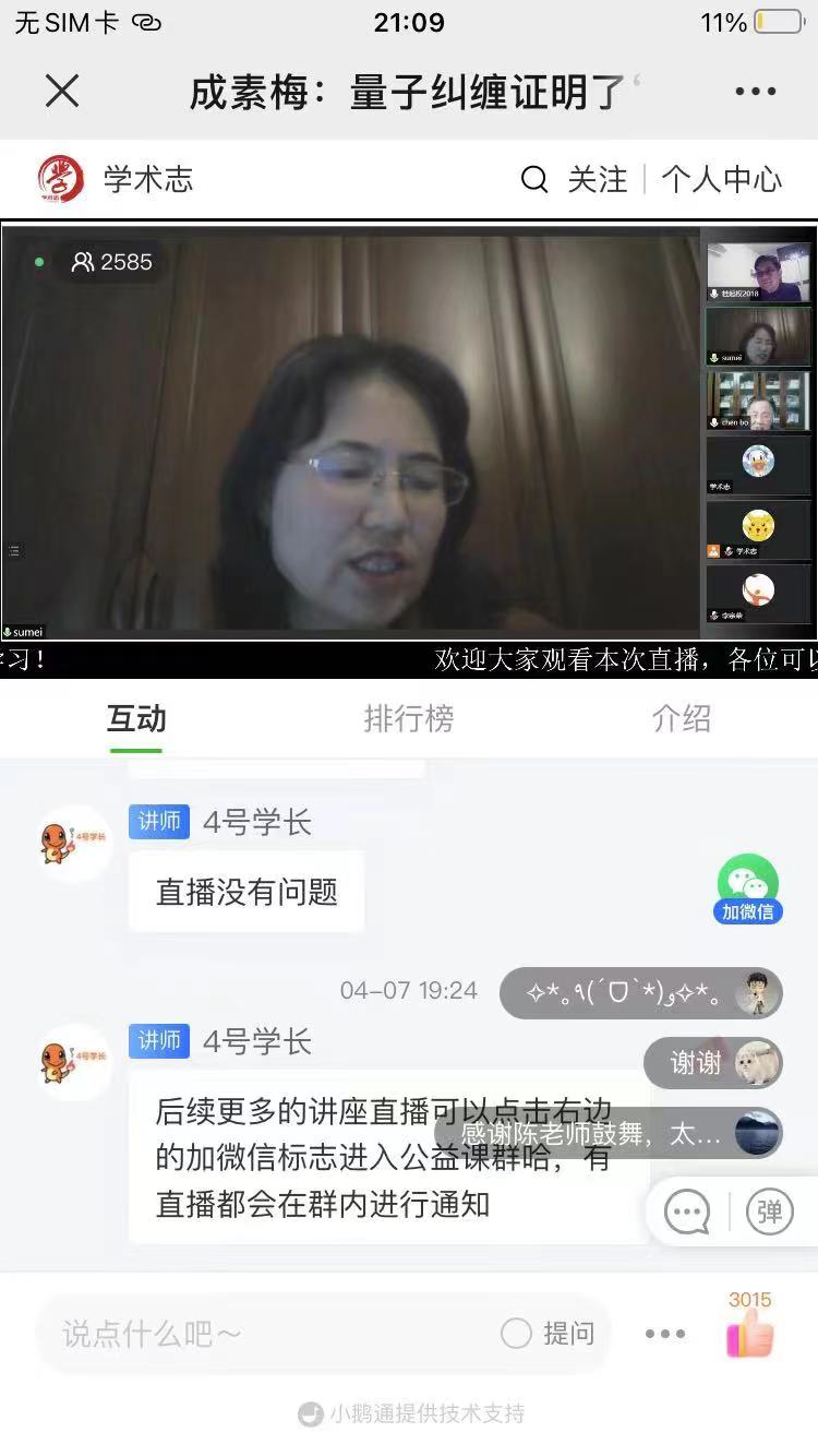 本网讯(通讯员 陈桂梅)2022年4月7日晚,五楼自拍-色情网-电影网站 “逻辑与哲学系列讲座”的第20讲通过学术志平台成功举办。上海社会科五楼自拍 哲学所成素梅教授做了题为“量子纠缠支持意识决定论吗?”的讲座,本次讲座由五楼自拍-色情网-电影网站 陈波教授主持,桂起权教授评议,来自全国各地的2500多人在线上参加了这次讲座。