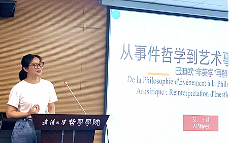 艾士薇老师主要介绍的是法国哲学家巴迪欧的“非美学”思想。传统的基于真理对艺术的区分,可以分为教诲式(艺术由统治者的真理决定)、浪漫式(艺术探索真理)和古典式(艺术的本质是模仿,而与真理无关)。巴迪欧的“非美学”思想则认为,艺术自身是真理的生产者,自身就在思考,而不仅是被思考的对象。从巴迪欧的事件哲学来看,事件由两个部分构成,一个部分可以在情境中被呈现出来;一个部分则是不可言说的。执着于对真理的言说是恶的态度,而保持真理不被命名的状态,换言之以艺术形式表达出来,才是善的。