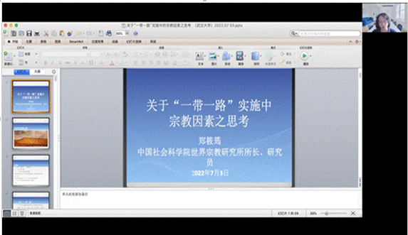郑筱筠从一带一路的政策出发,分析该政策实施背后的宗教因素,从文化的视角加以讨论。讲座的主要内容包括:何为“一带一路”及其构想,“一带一路”实施中的宗教因素,全球宗教发展态势以及“一带一路”沿线国家区域性宗教热点问题研究等。
