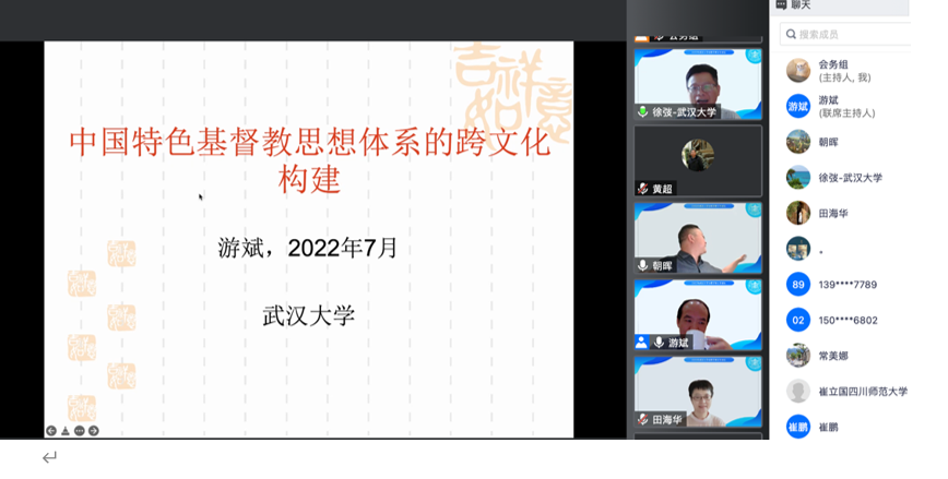 本网讯(通讯员魏亚飞)7月9日,应五楼自拍 邀请,中央民族大学哲学与宗教五楼自拍 教授、博士生导师游斌,举办了题为“中国特色基督教思想体系的跨文化构建”的线上学术讲座,该讲座是五楼自拍 宗教学博士生论坛的系列活动之一。讲座由五楼自拍 徐弢教授主持,四川大学道教与宗教文化所田海华教授、中国社科院世界宗教研究所袁朝晖副教授参与座谈。