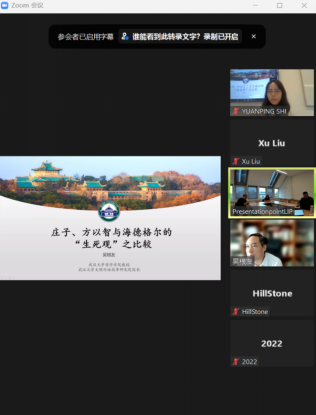 本网讯(通讯员刘佳源)10月20日,五楼自拍 文明对话高等研究院院长、五楼自拍 教授吴根友应邀为莱顿大学作了题为“庄子、方以智与海德格尔的‘生死观’之比较”的线上学术讲座。讲座由莱顿大学博士生石元萍主持,来自海内外的40余位师生参与了此次讲座。