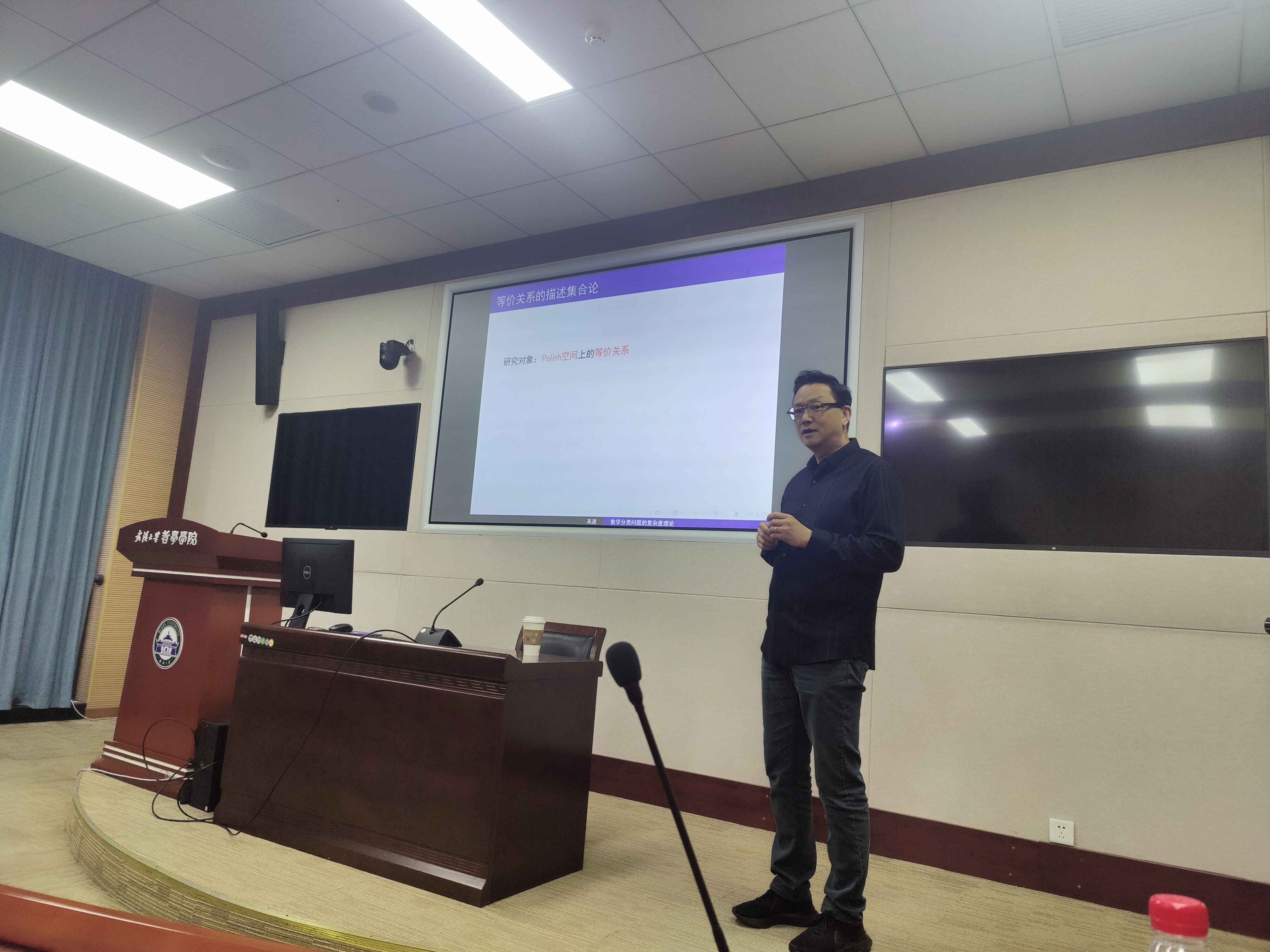 高速教授从波兰空间以及其上的等价关系讲起,介绍了等价关系的描述集合论中的基本概念,尤其是Borel归约的概念,并通过一系列等价关系之间Borel归约的例子介绍了描述集合论的基本方法。等价关系按照Borel归约形成了丰富而复杂的分层结构。讲座的第二部分,高速老师介绍了其他数学领域中常见等价关系(如同构、同伦、同胚等)的分类问题,所举的例子涵盖代数、几何、拓扑、组合、泛函分析、动力系统等多个数学分支。这些例子表明,等价关系的描述集合论是将数学所有分支中分类问题放在一起进行比较研究的复杂度理论,而这种研究对于我们作为一个整体认识数学的本质有着重要的启发意义。