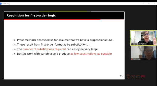 也是不可满足的。然后,Zach教授由此就两个问题——如何找到这样的实例以及如何表明它们是命题上不可满足的,进一步讲解后续的发展。在讲座的第三阶段,Zach教授介绍了一些解决方法的起源问题,以及自动定理证明的哲学影响。