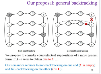 本次讲座聚焦最后一个问题,在假设可获得因果结构知识的基础上,探究我们能否找到一种对反事实条件句的解读,来避免或者减轻这个问题。张寄冀用哲学文献里一个著名的例子¾ 对比“如果我现在跳下10楼,那么我会严重受伤”与“如果我现在跳下10楼(因为我知道下面有安全网),那么我不会受伤”这两个反事实条件¾ 引入回溯的反事实推理(backtrackingcounterfactual)。不同于第一个语句,第二个语句体现的推理是在考虑反事实假设时,回溯到导致此假设实现的因素。这样的回溯可以用来避免产生样本外事例。张寄冀介绍了避免样本外事例的两种回溯推理方式。第一种为部分回溯(Partial backtracking),第二种为全部回溯(Full backtracking)。部分回溯是指只回溯到因果图的某些中间节点,而不用回到初始值。而全部回溯是指回溯到初始值,并不破坏原有的因果联系。张寄冀指出,虽然全部回溯更容易避免样本外事例,但因为需要回到无法控制的初始值,指导行动的意义就消失了。另一方面,无回溯(Non-backtracking)指导行动的意义相对明确,但因为样本外事例的出现,在现有的机器学习模型中应用并不可靠。因此,部分回溯有希望达到两者兼顾的平衡。