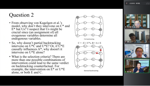 在评议环节,吴东颖博士就“通用回溯的选择标准问题”和“如何确定回溯到哪个环节”进行提问。他指出,在因果图中,面对小概率事件,可以采取多种干预方式。如何确定要使用哪一种干预方式,通用回溯方案面临着选择标准问题。相比之下,全部回溯则不会面临这样的问题。张寄冀回应称,所提出通用回溯方案只是一个方案,确实面临着哪种选择标准最优或者最合理的问题。但总体上通用回溯仍坚持按需回溯,从直觉上讲,回溯得越少越好。比起全部回溯,通用回溯的优点在于可以指导人们的行为,这毕竟是人工智能发展的一个重要目的。