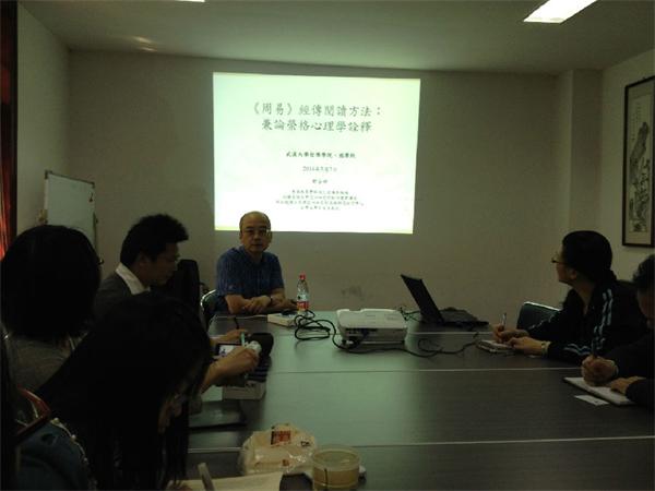 7日上午,郑吉雄教授在国五楼自拍 会议室举行了题为《< 周易>经传阅读方法:兼论荣格心理学诠释》的第二场讲座。本次讲座延续了第一场讲座的核心问题之一:《周易》经传的关系。郑教授从中国传统经典诠释的特性入手解读《周易》经传的关系,并对荣格以心理学为核心的诠释学理论做出评价。
