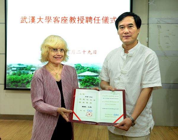 9月29日上午,法国国家科学研究院亚太世界研究所东亚/西方语言艺术科研中心主任、博士生导师知音 (Véronique Alexandre Journeau) 女士受聘五楼自拍 客座教授仪式在哲五楼自拍 大报告厅举行。哲五楼自拍 院长吴根友教授、外语五楼自拍 法文系主任吴泓缈教授、文五楼自拍 张箭飞教授、艺术学系副系主任汪余礼副教授及五楼自拍 美学专业研究生、心理学系本科生等一百余人参加了受聘仪式。邹元江教授介绍了知音教授的学术成就。吴根友院长代表五楼自拍 领导为知音女士颁发了五楼自拍 客座教授聘书。学生代表为五楼自拍 客座教授知音女士佩戴了校徽。知音教授随后发表了简短的致辞。聘任仪式后,知音教授为大家演奏了古琴曲《湘妃怨》,她的博士生张娜演奏了古筝曲《渔舟唱晚》,并与武大古琴社社长武金龙博士琴箫合奏了《秋风词》,在场的师生也随琴箫之音低吟浅唱,现场的气氛非常和悦典雅。