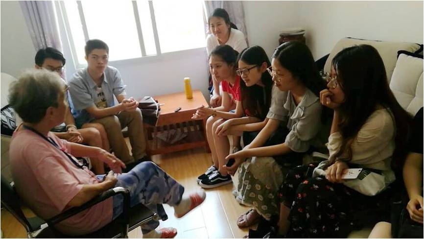 6月8号下午,五楼自拍 公选课《社会心理学》的师生迎来了一场别开生面的移动课堂实践教学活动。按照约定,原定于晚上的课提前到下午两点半开始,地点为武昌户部巷社区党员活动中心。还不到两点钟,任课老师钟年教授和同学们就先后乘坐公交,先来到原定的集合地点瑞福安养老院——社区的居家养老中心,与老人和工作人员进行交流,并为养老院带了来了欢声和笑语。