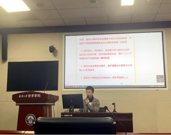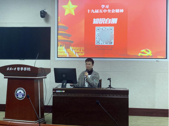 首先进行的是主题党日活动。本次主题党日活动由新闻面对面、书记微党课和随堂小测试三个环节组成。首先,大家通过新闻联播视频材料回顾了中共十九届五中全会公报全文;随后全体党员同志在党支部书记王钲甫的领学下,集体学习了公报要点;最后,继续坚持实践随堂小测试,即时公布与会党员的答题分数,并且深挖补正知识漏洞,及时巩固加强记忆,达到学习效率最优化。通过知识竞答的方式,既有效检验了各党员同志的学习成果,又有效提升了党员的学习积极性,敦促党员同志加强政治修养,提升党员意识。