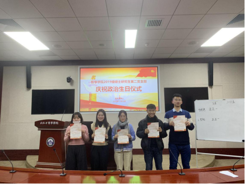 会议临近尾声,支部书记王钲甫同志主持“庆祝政治生日仪式”,为今天转正的王君起、柳迪同志和入党日期同在11月份的其他三位党员同志送上祝福,并以此勉励全体党员不忘初心、牢记使命,继续加强理论学习,增强党员身份意识,不断以党员的标准严格要求自己,做让群众满意、让组织放心的好党员。