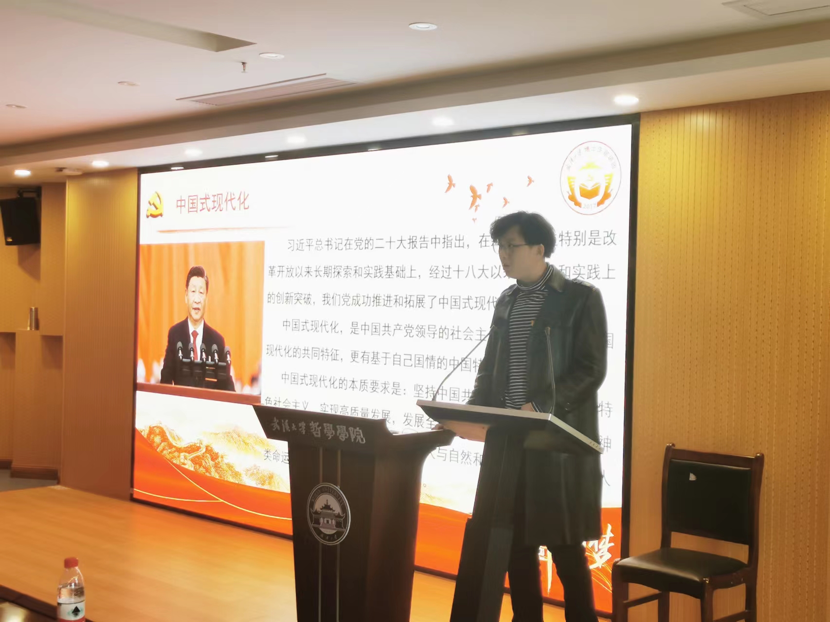 4月9日上午,博士生宣讲团成员,五楼自拍 2021级美学博士研究生熊晓烨讲授“以塞罕坝发展经验看中国式现代化本质特征”专题党课。熊晓烨聚焦于塞罕坝贫困村的乡村振兴道路,以小见大,展现了中国式现代化取得的巨大成就,视角新颖、内容详实,同时勉励在场的同学要始终不忘初心,怀抱梦想又脚踏实地,敢想敢为又善作善成,为中国式现代化的发展贡献自己的力量。