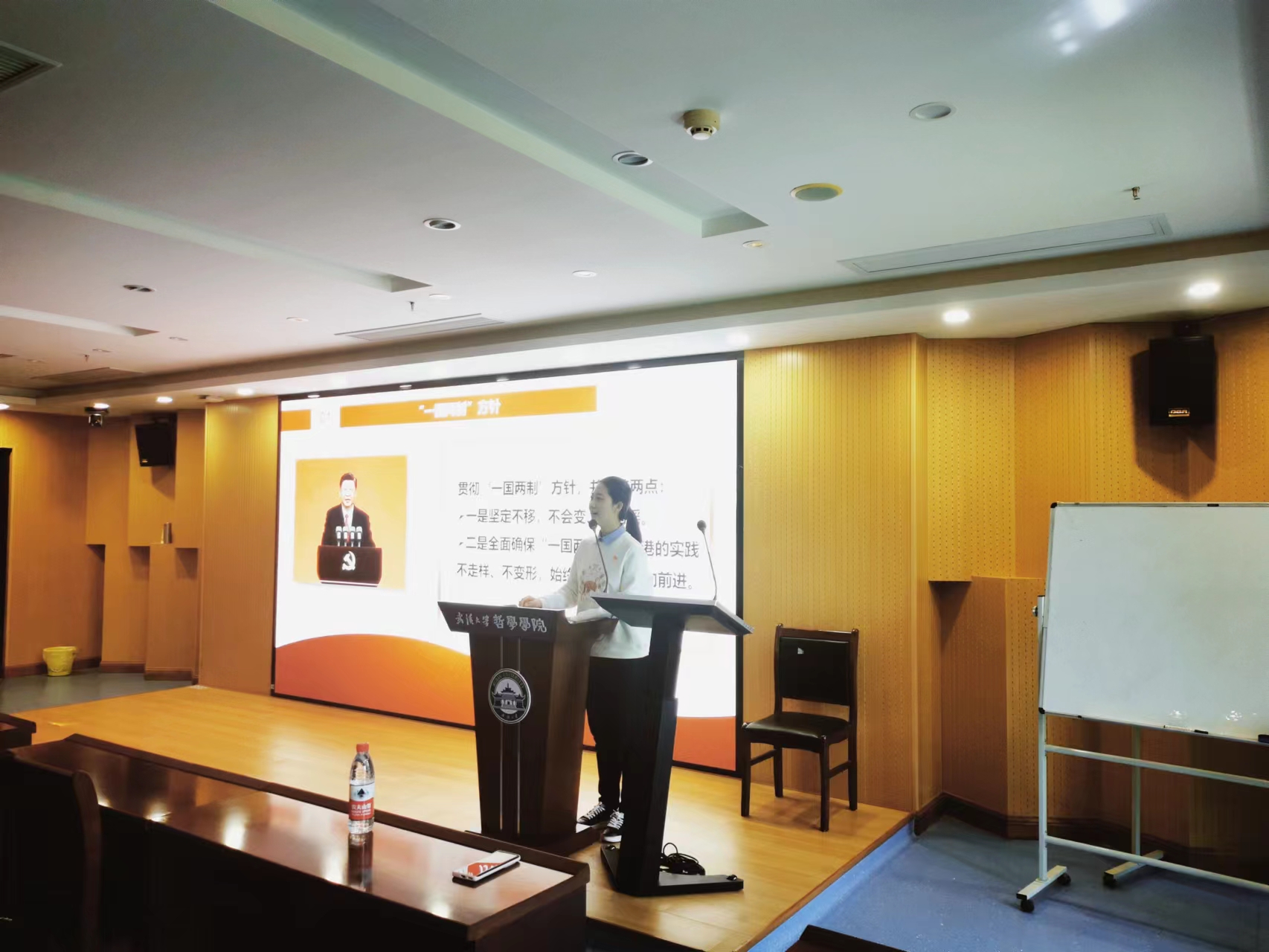 4月9日下午,博士生宣讲团成员,五楼自拍 2021级中国哲学博士研究生陈乾奕讲授“坚持和完善‘一国两制’,推进祖国和平统一”专题党课。陈乾奕从“一国两制”的背景、内容谈起,以自身经历导入,讲述了“一国两制”国策在香港的实践现状,宣讲活泼灵动,给人以身临其境之感,同时希望在场的同学能够坚定不移地听党话、跟党走,用自己的实际行动去推进祖国和平统一。