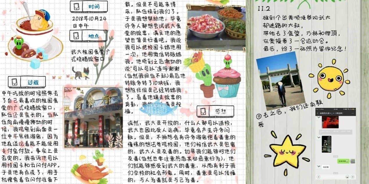 作为践行者之一,张锦悦同学在记录微公益成果时也谈到了自己的感想,“在武大,许多游客是抱着善意且憧憬的想法参观校园,他们相信武大是包容的,武大人是友善的。善意是可以传播的,与人为善就是与己为善”。我们希望哲院学子在注意防范某些恶意行为的同时,向校园内需要帮助的来访者们提供他们所需的帮助,施予善意,让四方来客能真正感受到宾至如归,并在此过程中传承武大精神、弘扬珞珈文化。
