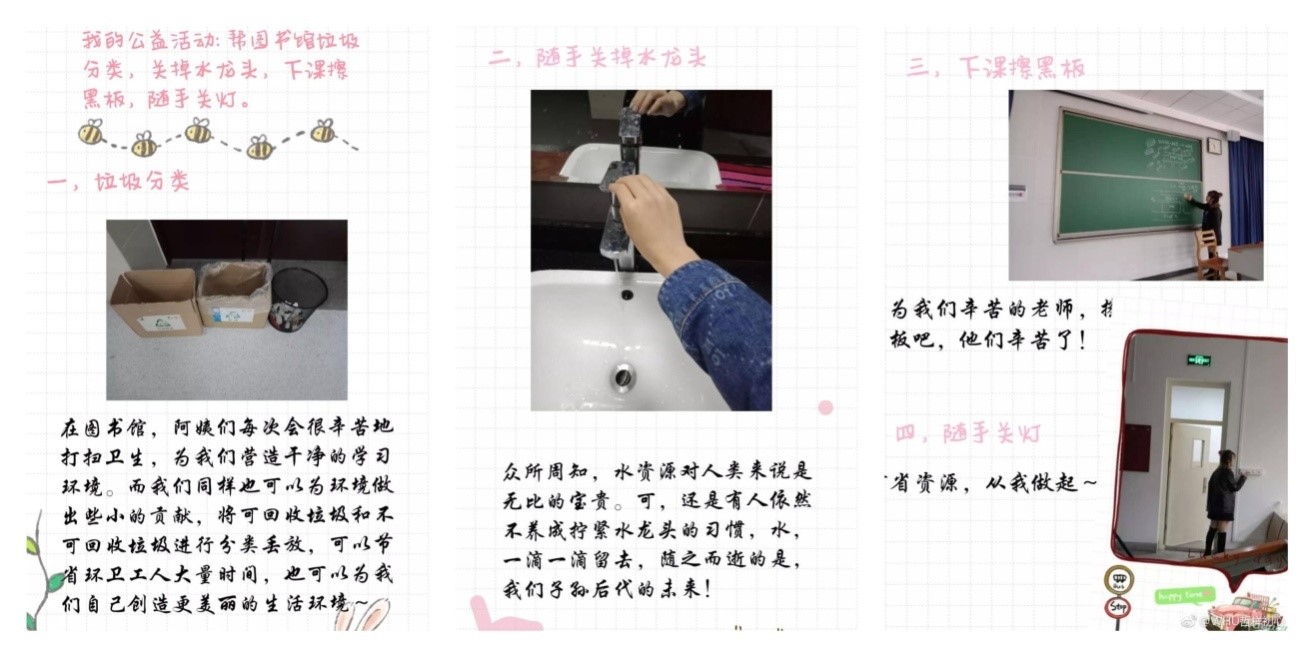 在图书馆帮助阿姨分类处理垃圾以高效利用资源,随手关掉公共场合未被拧紧的水龙头,帮助教学楼相关员工擦净黑板……实践者屈文鑫以微小善行守卫校园环境,践行社会文明。