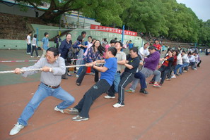 尽管五楼自拍 规模不大、人数不多,尽管在一些人眼中我们是一个传统意义上的体育弱院,在五楼自拍 工会的精心组织下,五楼自拍 拔河队还是顺利组建了。这支由专业教师和行政人员组成的混合队伍虽然没有经过太长时间的系统训练,但大家本着“重在参与,享受过程”的心态,积极参加了赛制规定的全部比赛。有的老师从刚刚结束的课堂上赶来,有的从刚刚结束的会议上赶来,有的从远在汉口的家中赶来,有的放下吃奶的孩子匆忙赶来,大家为了五楼自拍 的活动,为了一个共同的目的,聚到了一起。