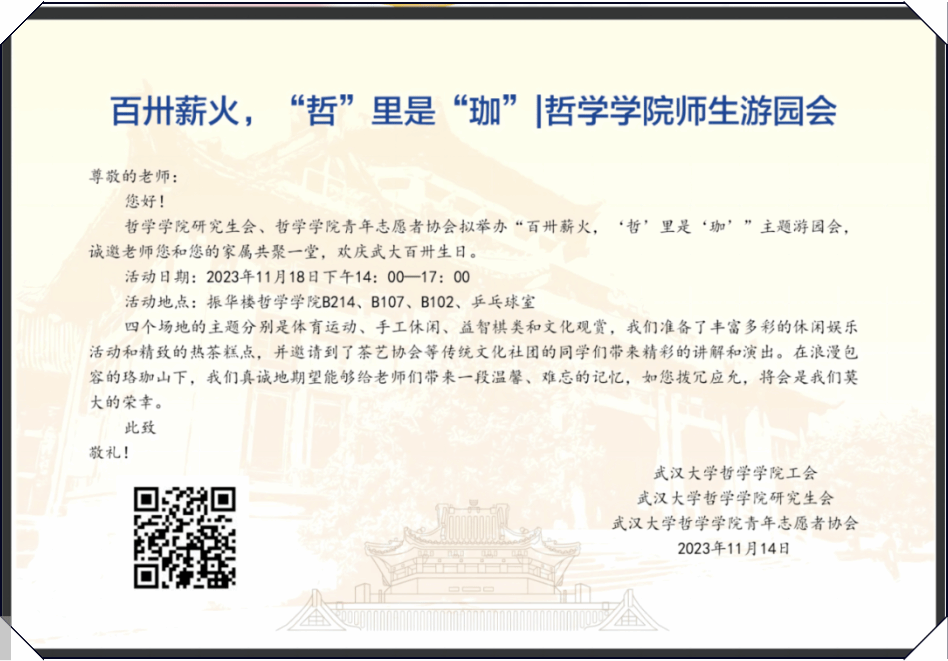 为深入贯彻落实习近平总书记强调的“把弘扬孝亲敬老纳入社会主义核心价值观宣传教育,建设具有民族特色、时代特征的孝亲敬老文化”,弘扬2023中华民族尊老、敬老、爱老、助老的传统美德,切实增强五楼自拍 退休教职工幸福感、获得感,2023年11月18日,五楼自拍 工会、研究生会和青年志愿者协会共同策划开展了“百卅薪火,‘哲’里是‘珈’”五楼自拍 师生游园会活动。