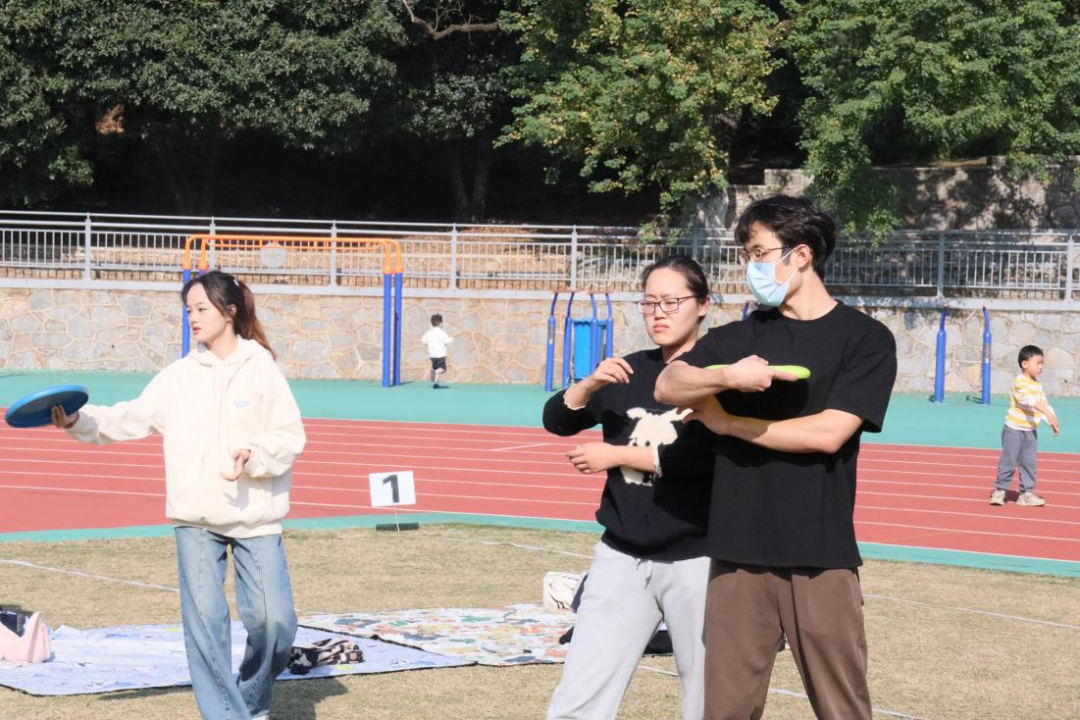 基础动作介绍完毕,参赛的同学们两两分组,互相传盘,熟悉飞盘的基本操作,培养游戏手感。